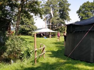 Nach einiger Zeit fuhren wir weiter zum Lagerplatz. Dort angekommen, erwartete uns die Küche, die schon fleißig unsere Kochstelle aufbaute. Zügig fingen wir an, auch unsere Schlafzelte aufzubauen und die Gegend auszukunden (vor allem der kleine Bach neben unserem Lagerplatz). Die Pfadis bauten sich im angrenzenden Wald ein kleines Hängemattenlager.