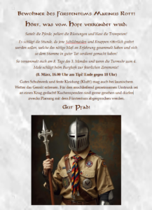 Und zwar feiert der Burschenverein Rott a. Inn nächste Woche sein 15 jähriges Bestehen. Zur Eröffnung der Festwoche findet nächsten Donnerstag, 17.07., ein Festeinzug (von der Schule zum Festzelt in Meiling) statt, zu dem auch wir herzlich eingeladen sind. Im Anschluss haben wir reservierte Plätze im Zelt und wie auf dem Bierfest gibts auch wieder Pommes (juhuuu!!)