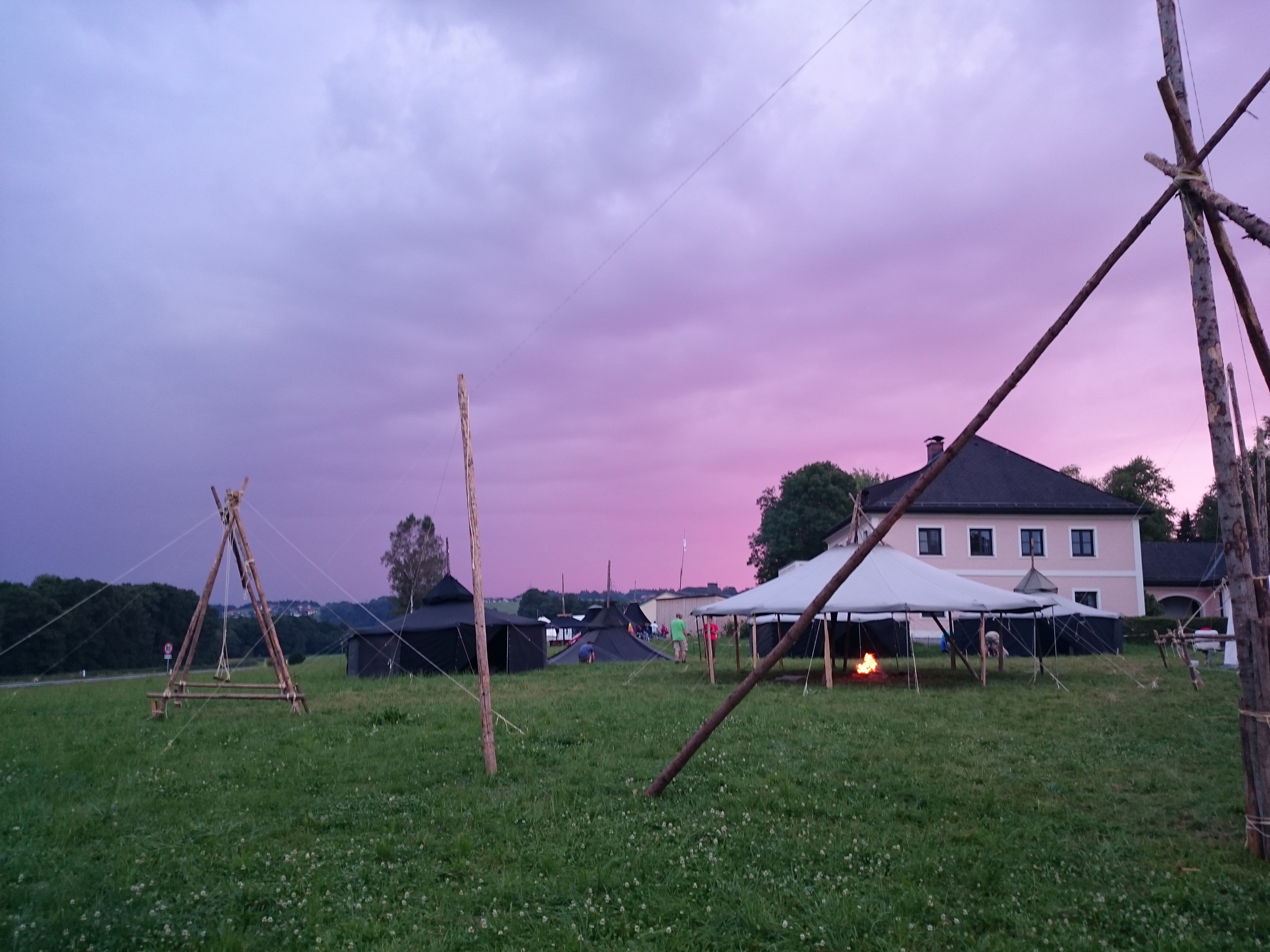 Der Morgen fing mit einem tollen PMS (peinliches Morgenspiel) und Frühstück an. Danach teilten wir uns in verschiedene Lagerbauten- Gruppen auf und fingen an, unseren Lagerplatz zu gestalten. Manche bauten eine Lagerfeuerüberdachung, andere einen super hohen Bannermast, eine Waschstation, eine Dusche, ein Geländer (damit man nicht unfreiwillig im angrenzenden See baden geht) oder den Parkour für das Spiel am Nachmittag.